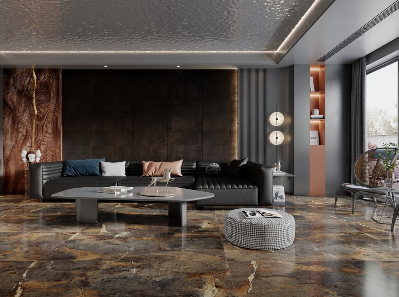 层层叠叠的纹理,在光线的照耀下,泛出点点波光涟漪,强化空间立体感,使空间焕发出全新的时尚格调。